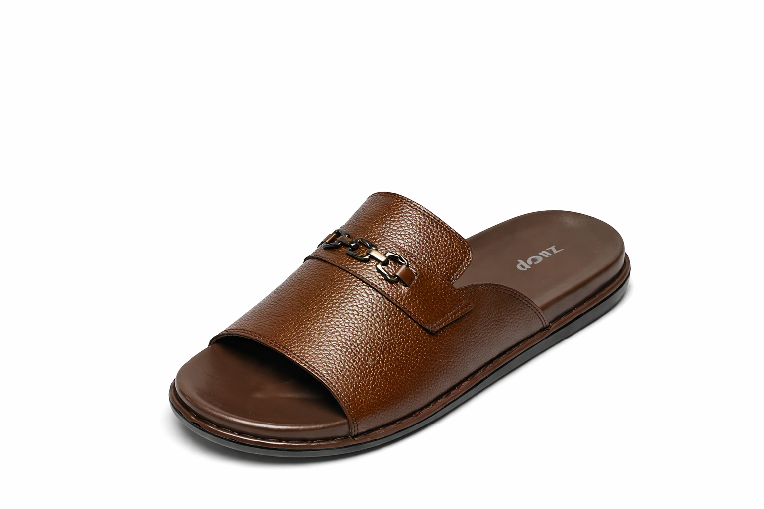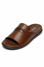 Step out in style and comfort with these Men’s Brown Leather Slippers . Crafted from high-quality, textured leather, these sandals feature a sleek dark metal chain accent across the strap for added flair. The contoured footbed and durable sole ensure a perfect fit and all-day comfort, whether you’re lounging at home or out for a casual outing. The versatile brown shade complements various styles, making them a must-have addition to your wardrobe.